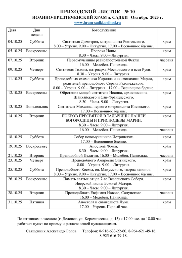 По пятницам в часовне (г. Дедовск, ул. Керамическая, д. 13) с 17.00 час. до 18.00 час. работает пункт по приему и раздаче вещей нуждающимся.